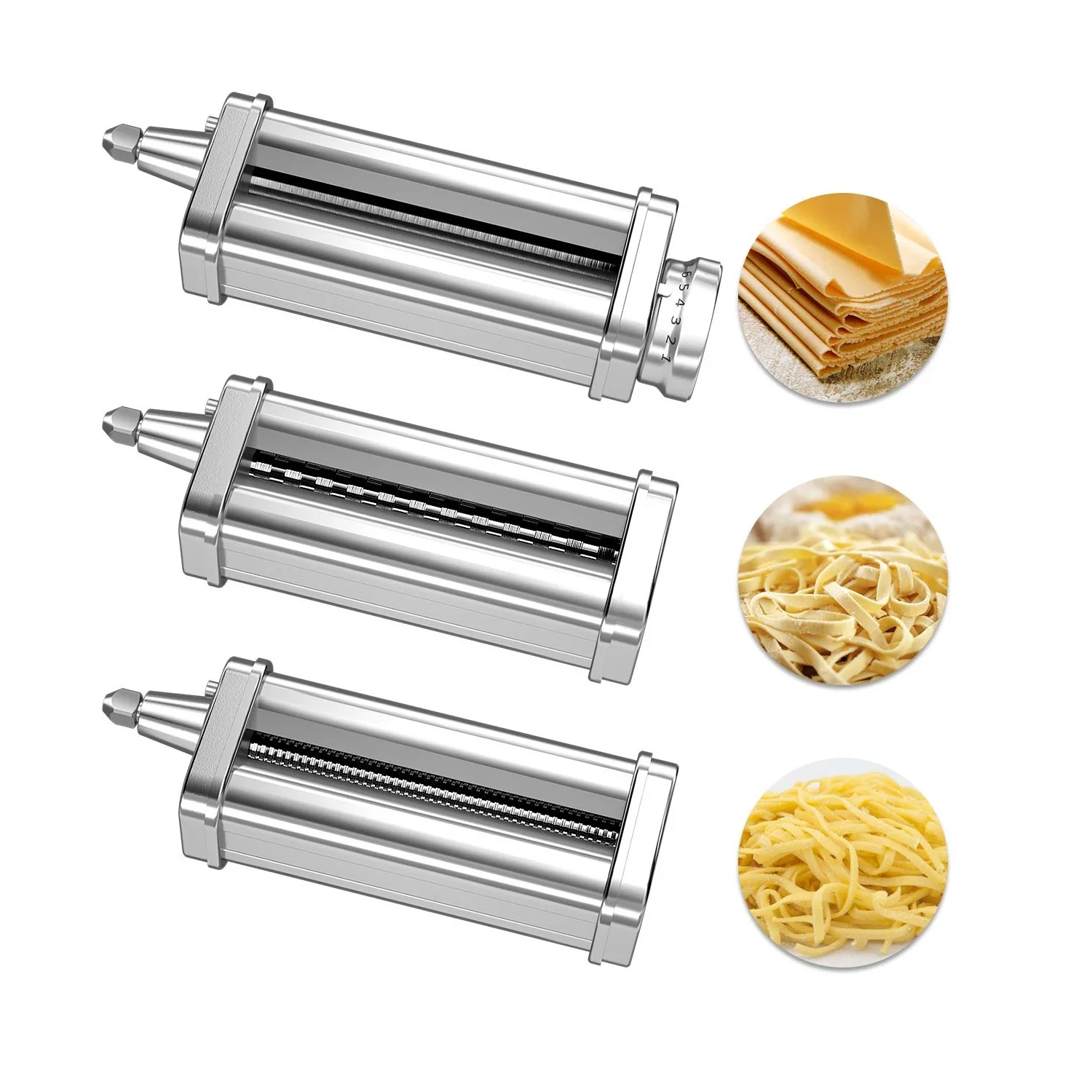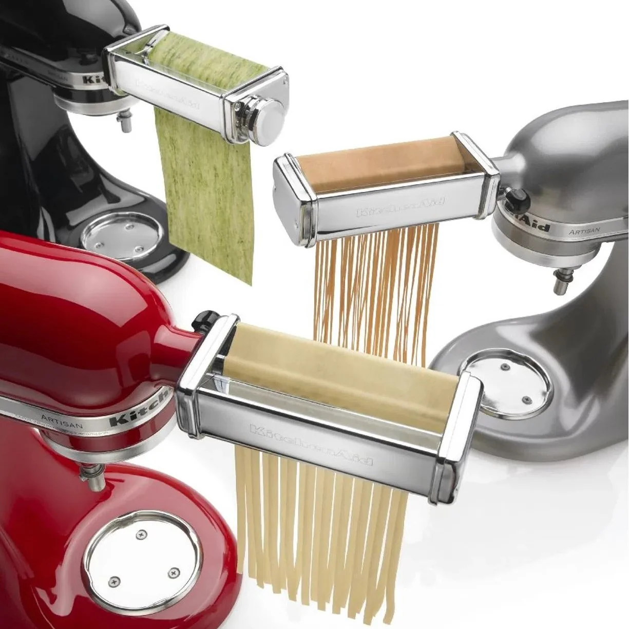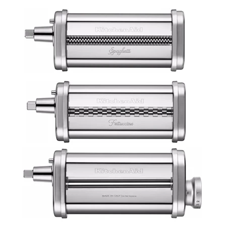 Traiga el sabor de la pasta fresca a su hogar con este juego de accesorios KitchenAid® Stand Mixer. Este conjunto de metal de 3 piezas contiene un rodillo de pasta, un cortador de fettuccine y un cortador de espagueti
