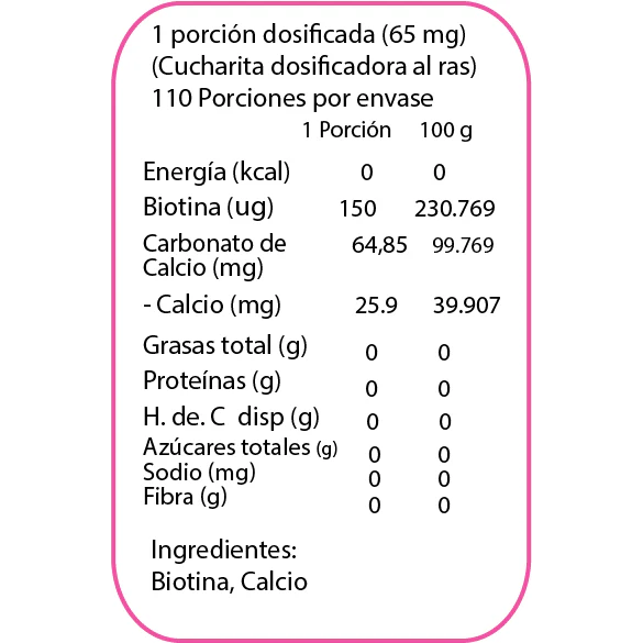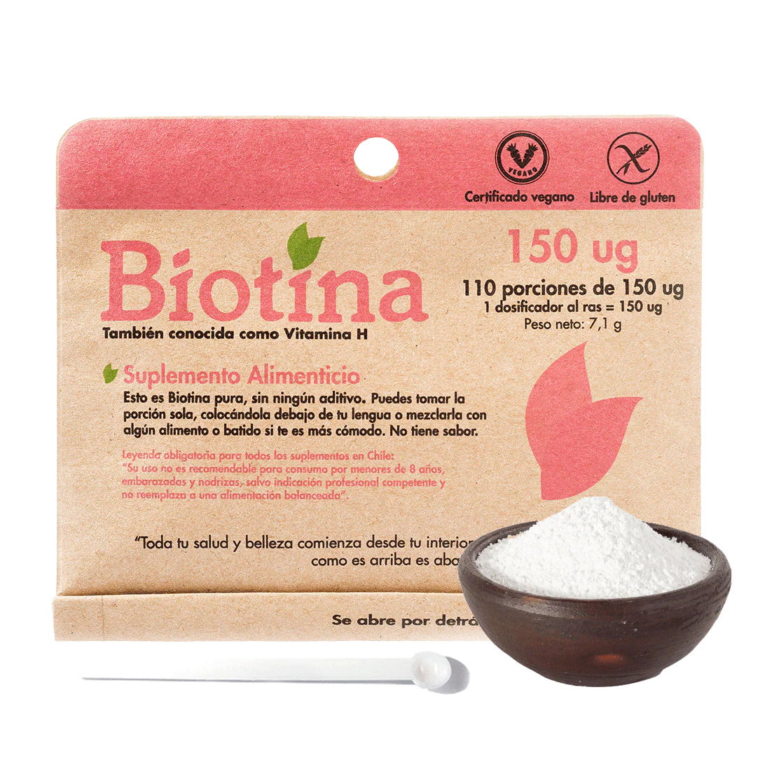 Suplemento en polvo, toma 1 cucharita dosificadora al ras por día, obteniendo 150 ug de Biotina o las cantidades que te haya recetado un nutricionista o médico.