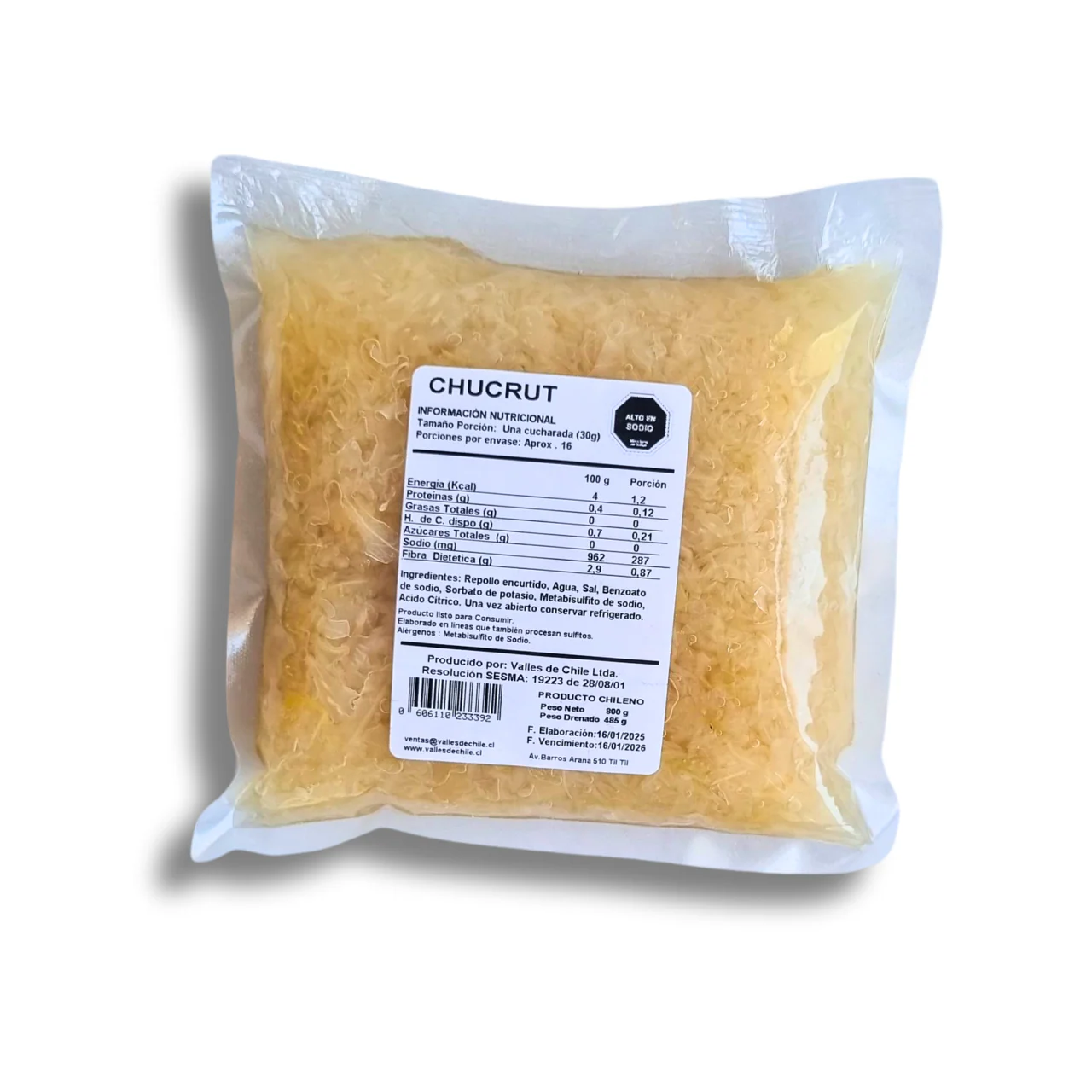 Ingredientes: Repollo Encurtido, Agua, Sal, Benzoato de Sodio, Sorbato de Potasio, Metabisulfito de Sodio, Ácido Cítrico.