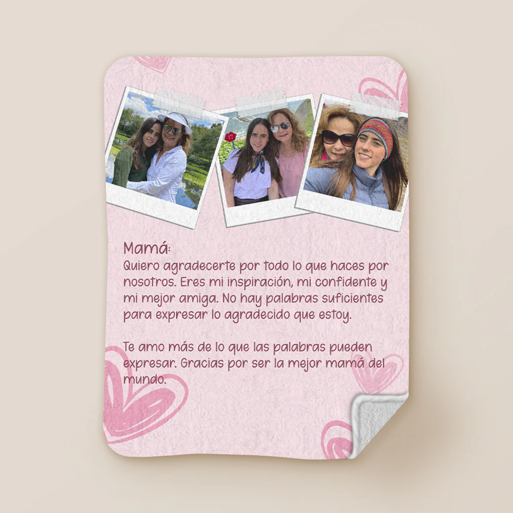 Envuelve a mamá en amor y recuerdos con nuestra frazada personalizada. Esta acogedora frazada no solo está adornada con las fotos más preciadas de tu familia, sino que también ofrece un espacio especial para que puedas escribirle una carta llena de cariño y gratitud. Es el regalo perfecto para expresar tu amor y aprecio.