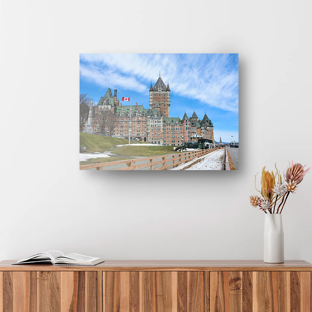 «La primavera arribando a Québec, Canadá». Daniel Herrera. Fotografía de un edificio en Québec a la luz del día. La nieve desaparece para dar paso al verdor.