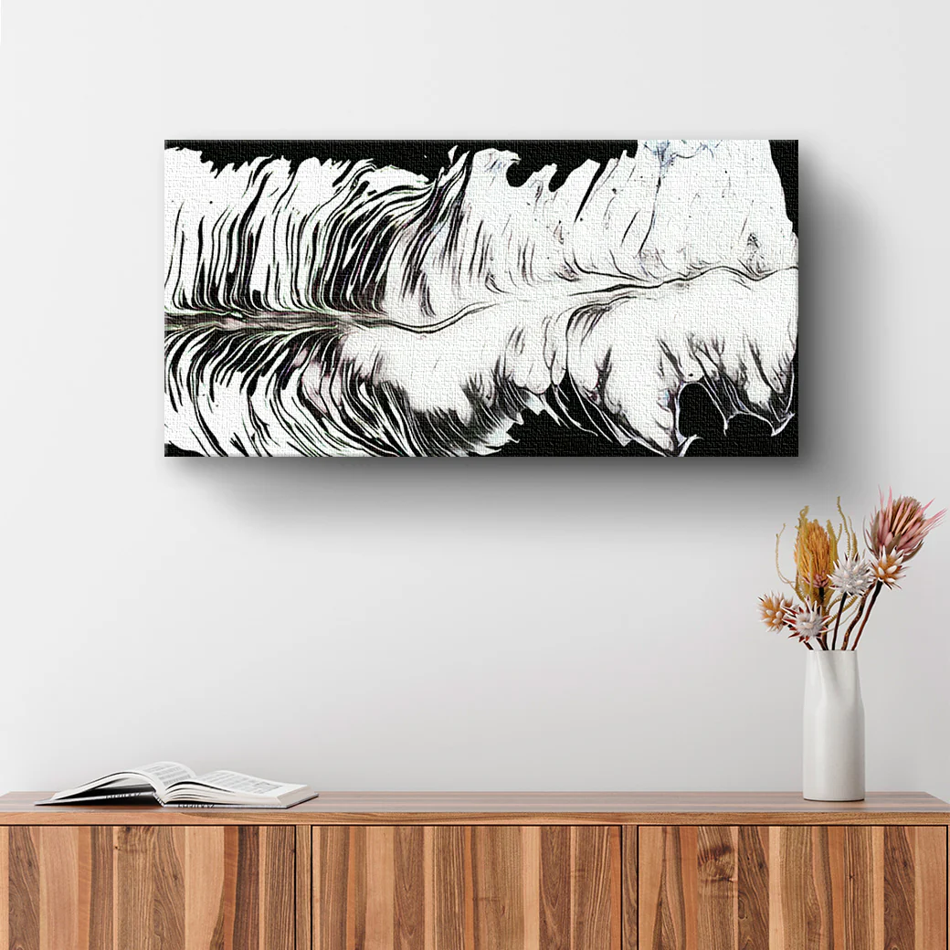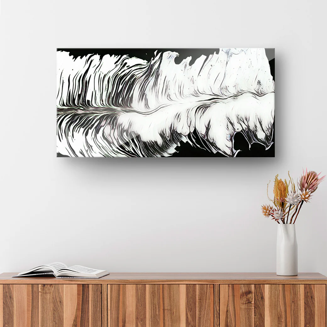 Cuadro decorativo con una obra abstracta en blanco y negro, con forma de una pluma, por el artista Emanuel Barrera. Una decoración moderna y sencilla.