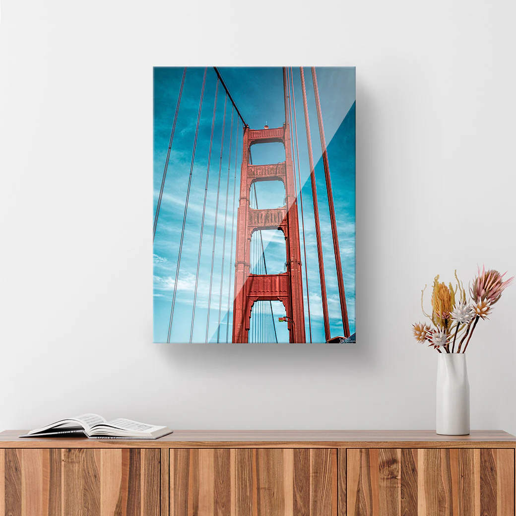 Cuadro decorativo con una fotografía del Golden Gate vista desde no tan lejos y con un enfoque más hacia la altura que se puede presenciar, por León Hernan.
