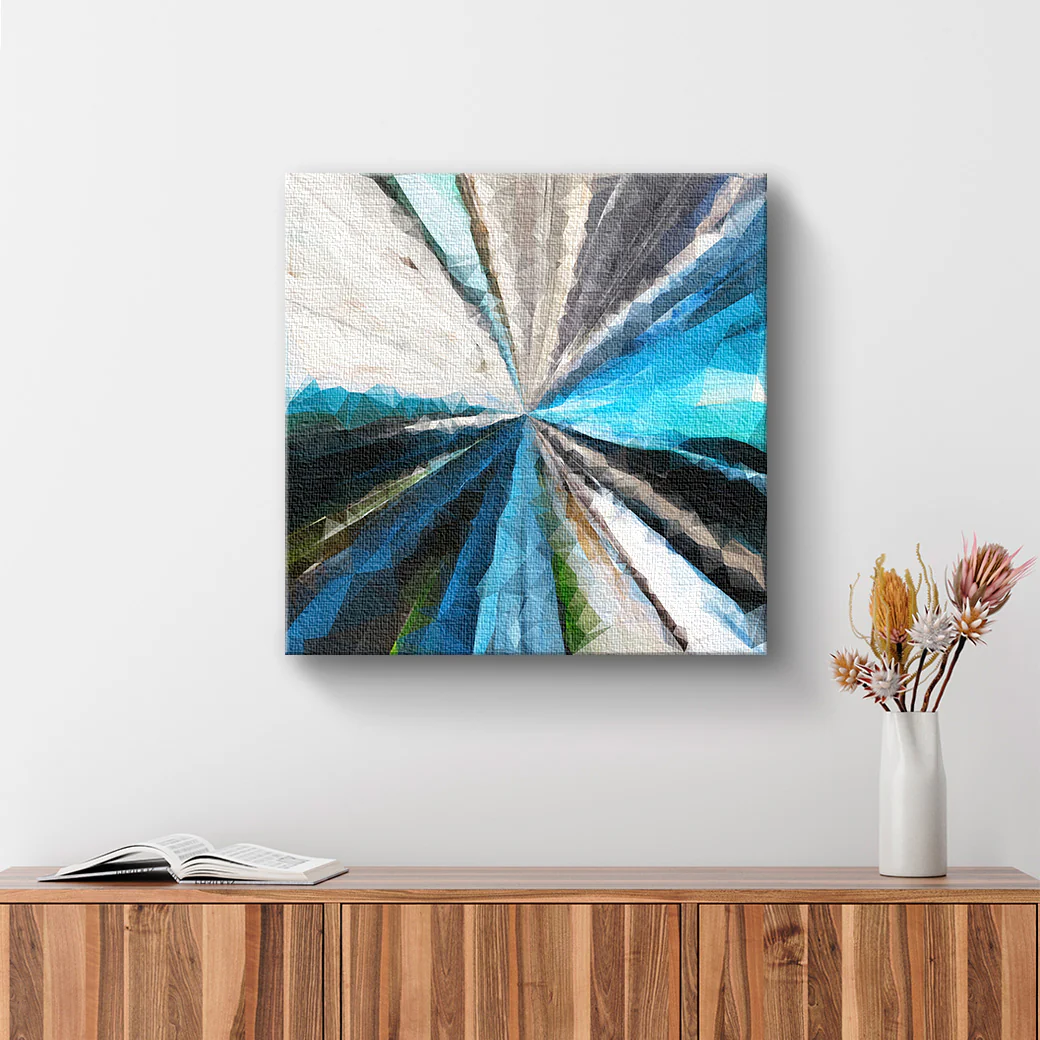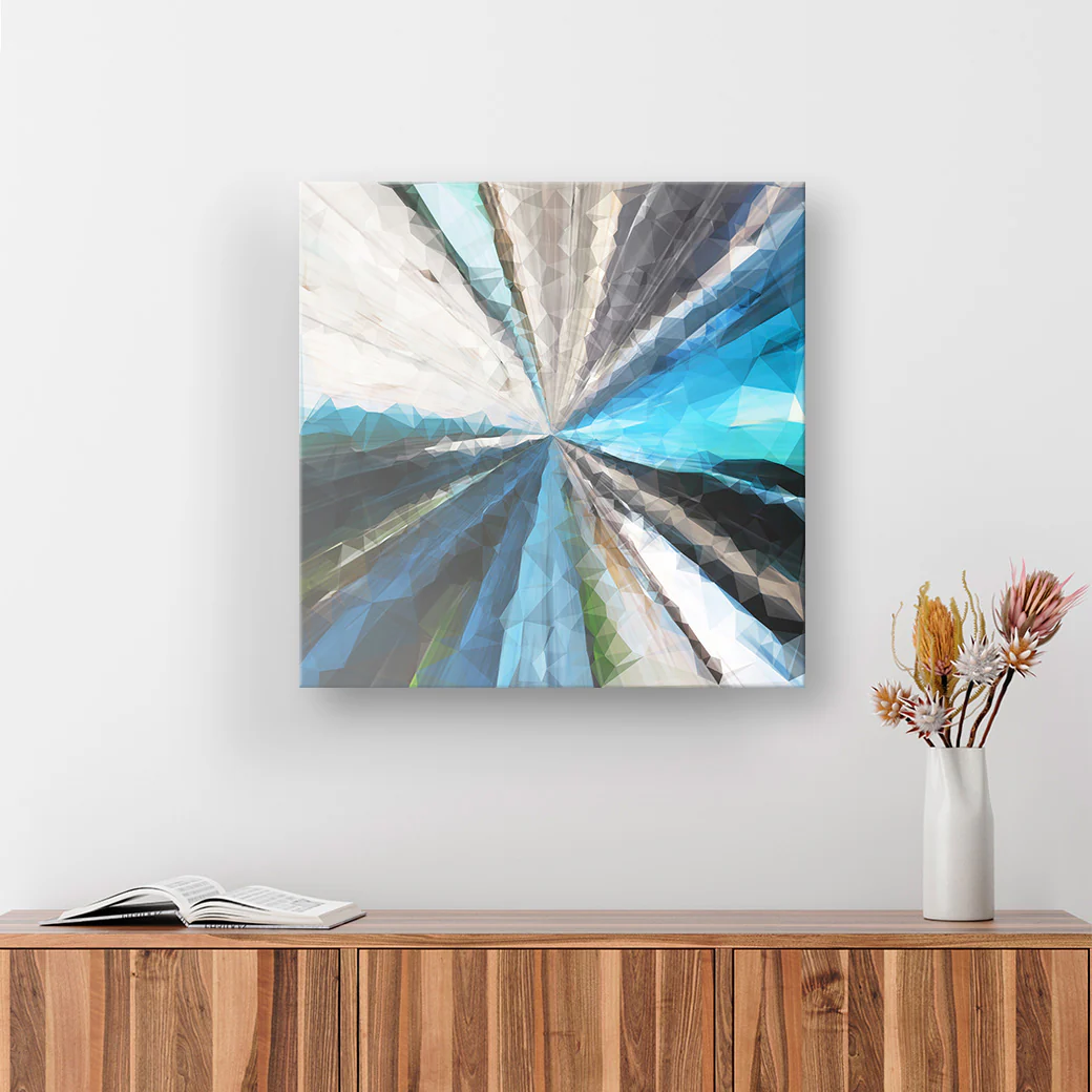Este cuadro decorativo muestra una obra abstracta en diferentes tonalidades azules, simulando la forma de un vitral, por el artista Emanuel Barrera.