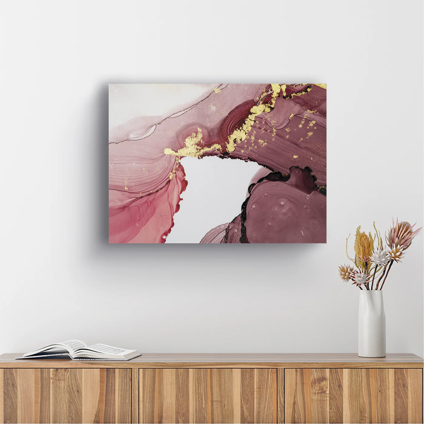 Este impresionante cuadro presenta un diseño estilo mármol que combina la riqueza del color vino con el lujo del dorado. Las manchas de pintura fluyen de manera orgánica, creando un efecto visual que evoca la elegancia atemporal del mármol natural.