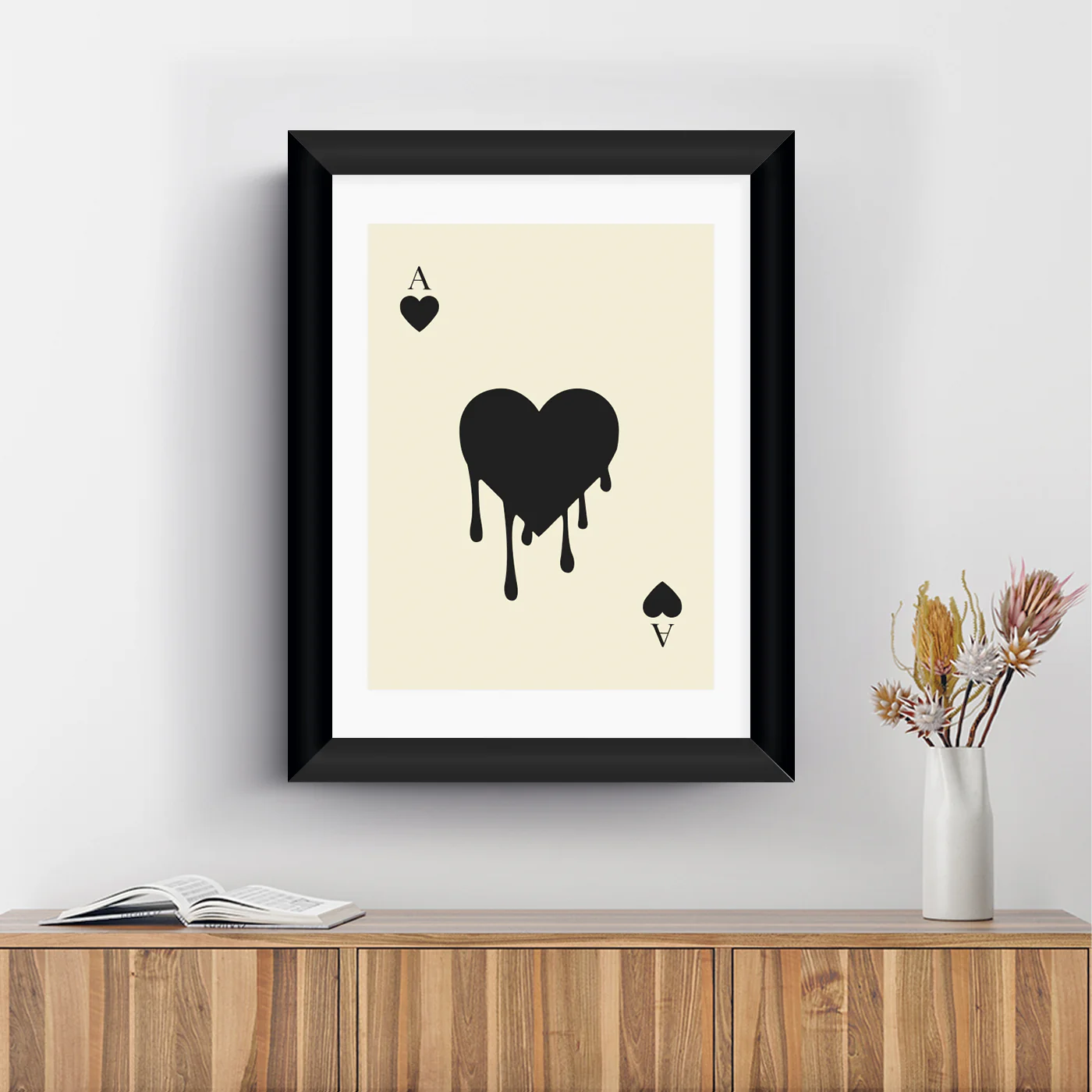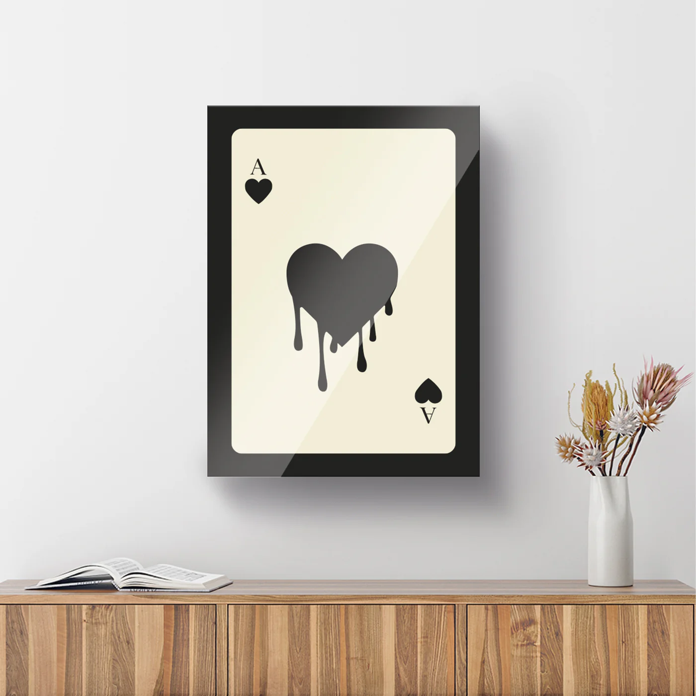 El cuadro muestra un fondo de un beige pastel que contrasta con un as de corazón negro, situado en el centro. En su interior, un corazón derretido, representado con negro obscuro, parece fluir y fundirse con la oscuridad circundante. La imagen evoca una sensación de intensidad emocional, sugiriendo la fusión de la pasión con el amor.