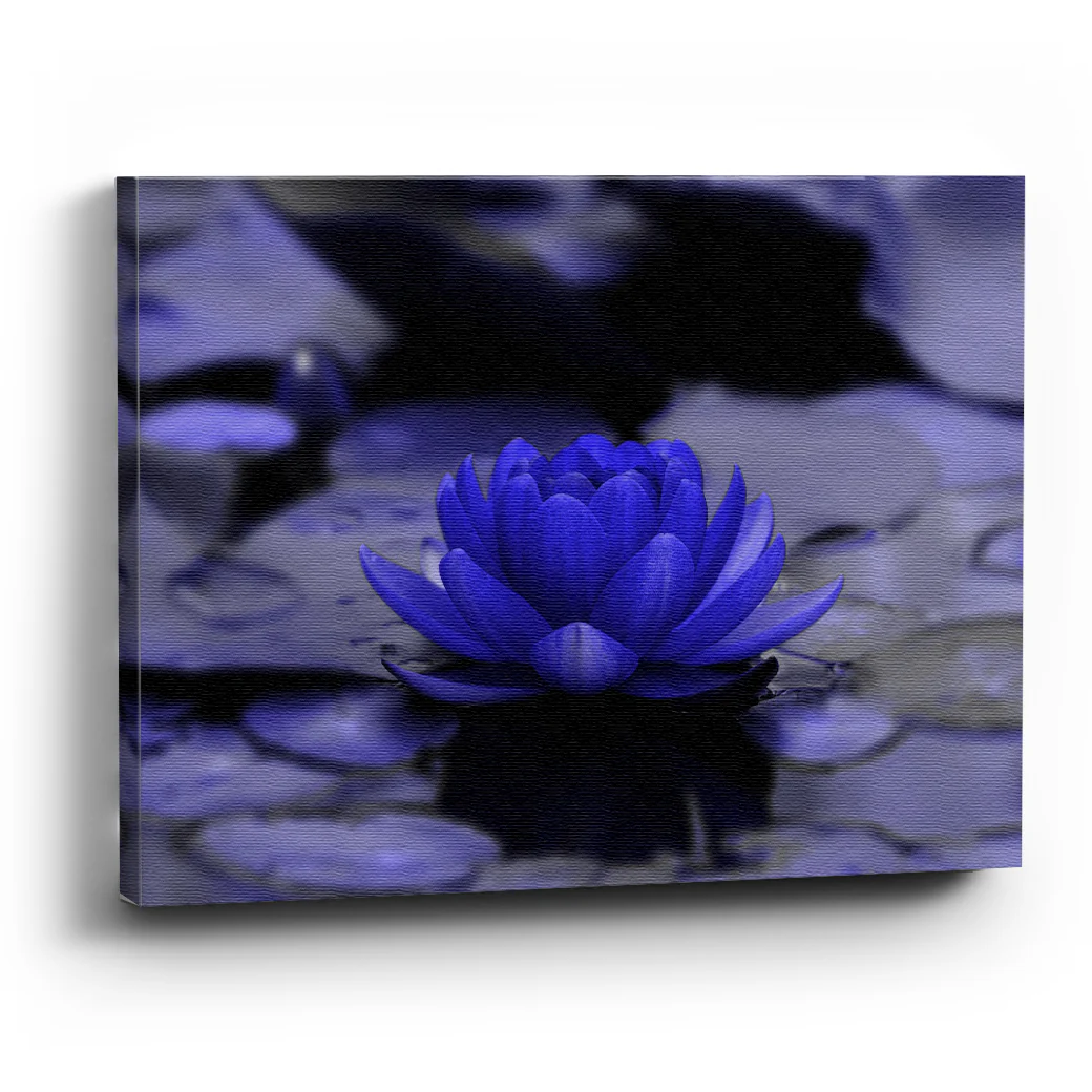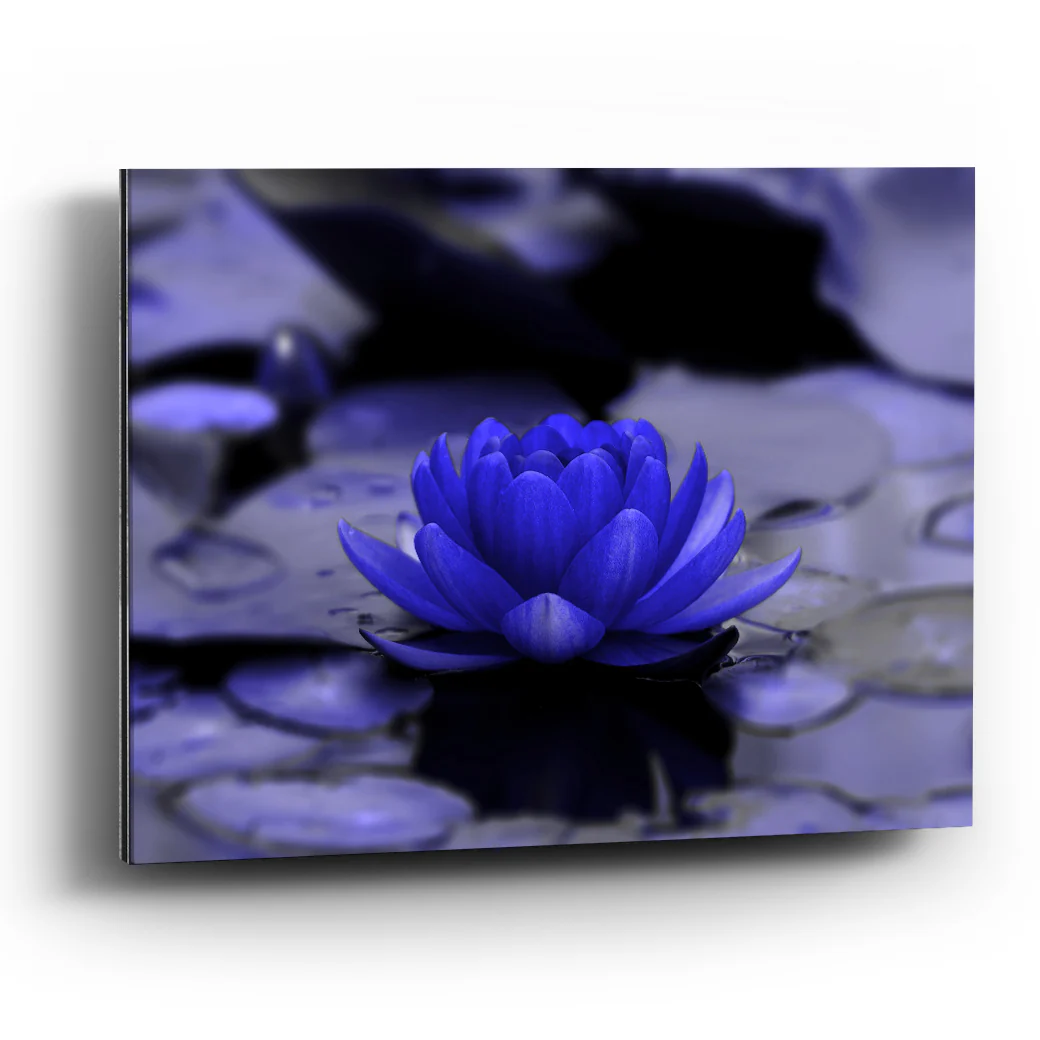 Es una fotografía con una flor de loto de pétalos azules postrada en un lago. Una decoración sombría y oscura para ambientar tus espacios.