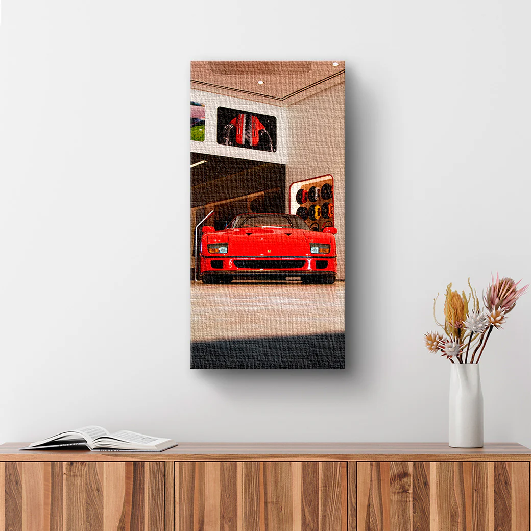 Muestra la fotografía de un Ferrari F40 Rosso Corsa de color rojo, tomada por el fotógrafo Alessandro Bassignana. ¡Atrévete a comprar este cuadro!