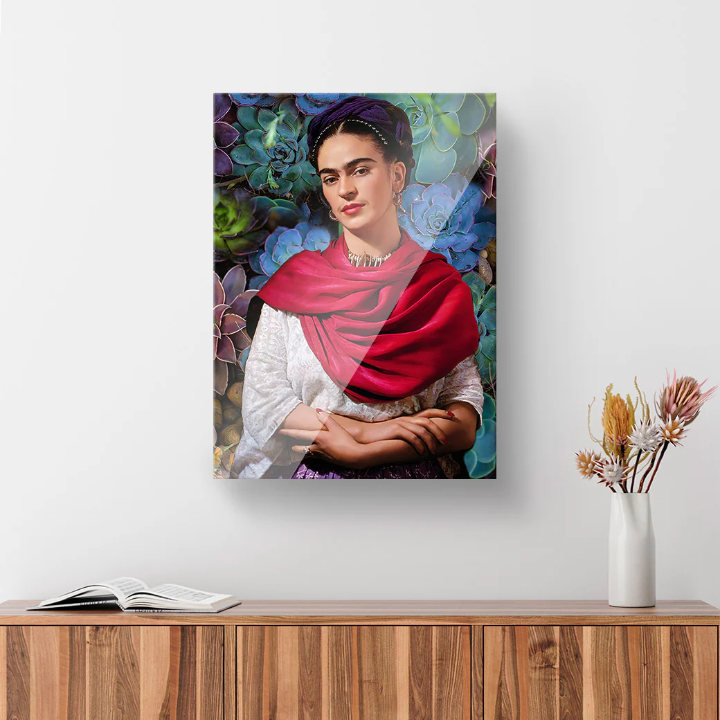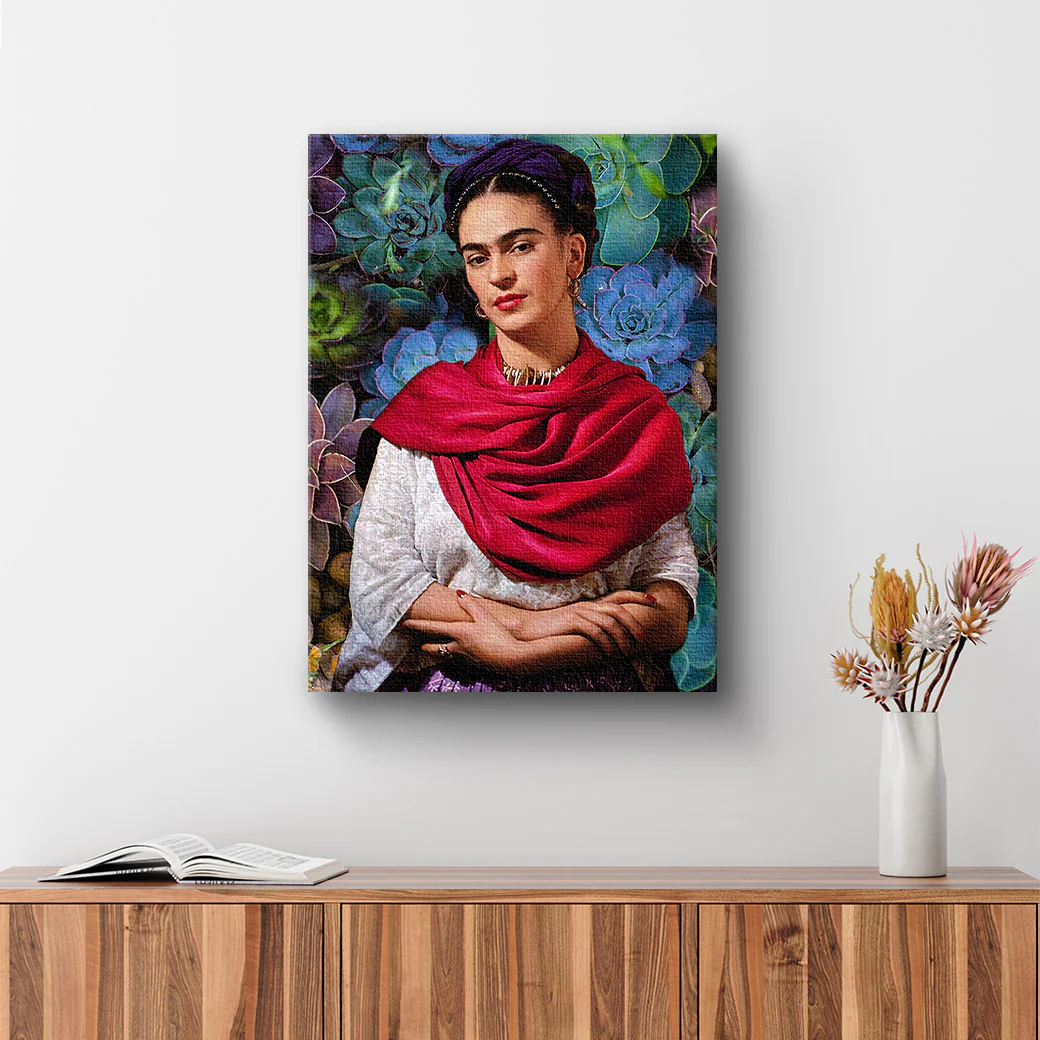 Muestra una fotografía de la famosa pintora mexicana Frida Kahlo. Es reconocida como un icono pop de la cultura de México.