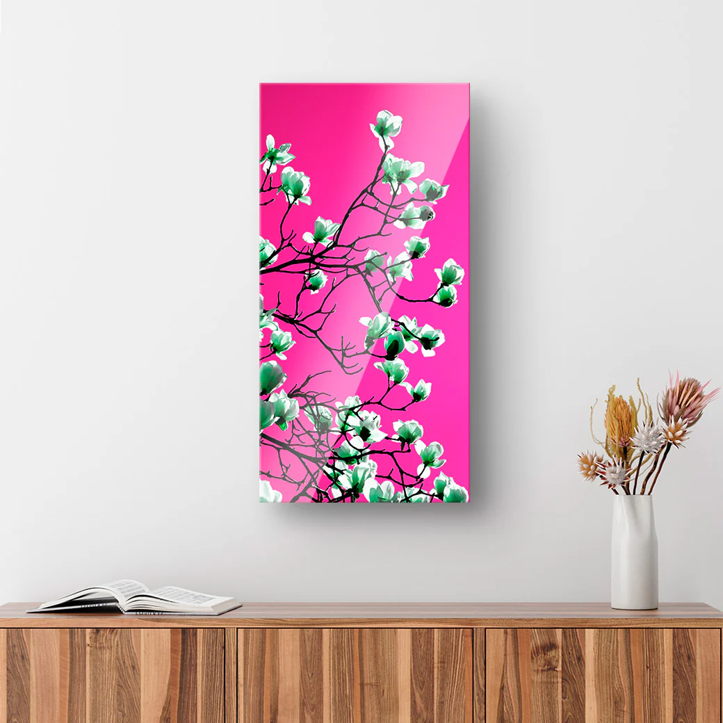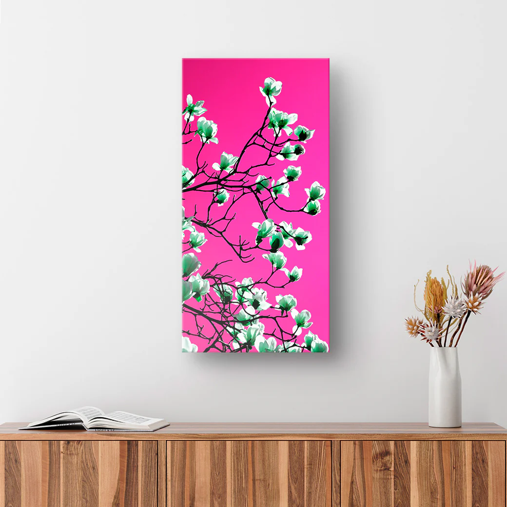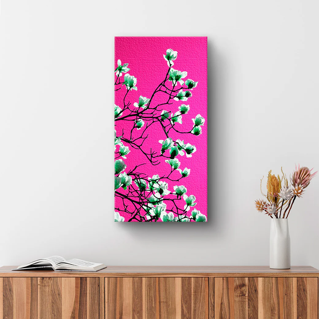 ¡Lleva color a tus espacios con un cuadro decorativo de Magnolia! Sobre un fondo de color fucsia, vemos las ramas de un árbol con pequeñas flores blancas.