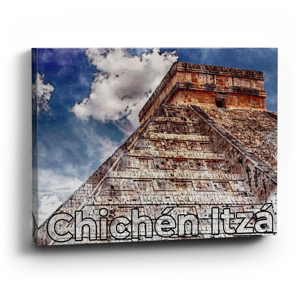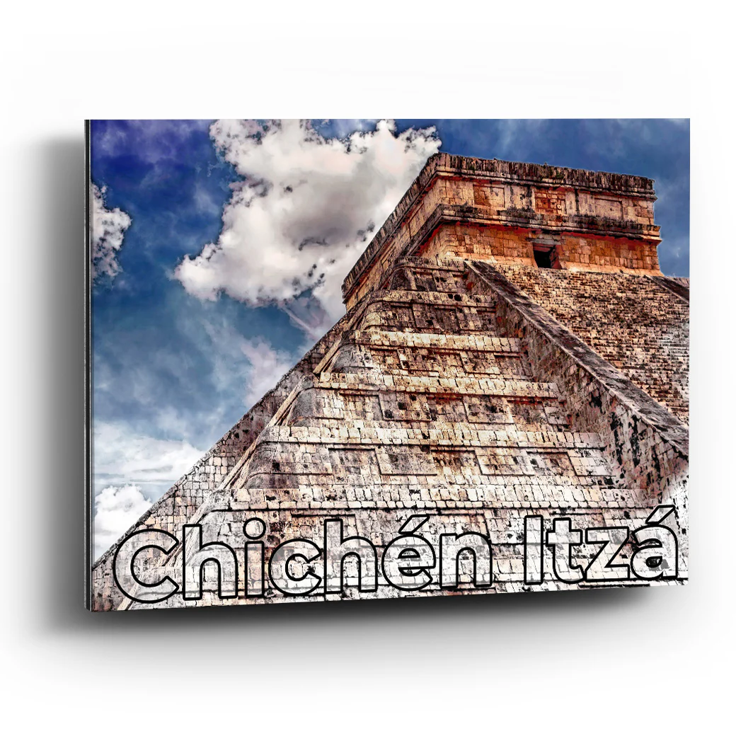 Muestra una fotografía de Chichén Itzá, una de las 7 maravillas del mundo de la cultura Maya que se encuentra en la península de Yucatán de México.