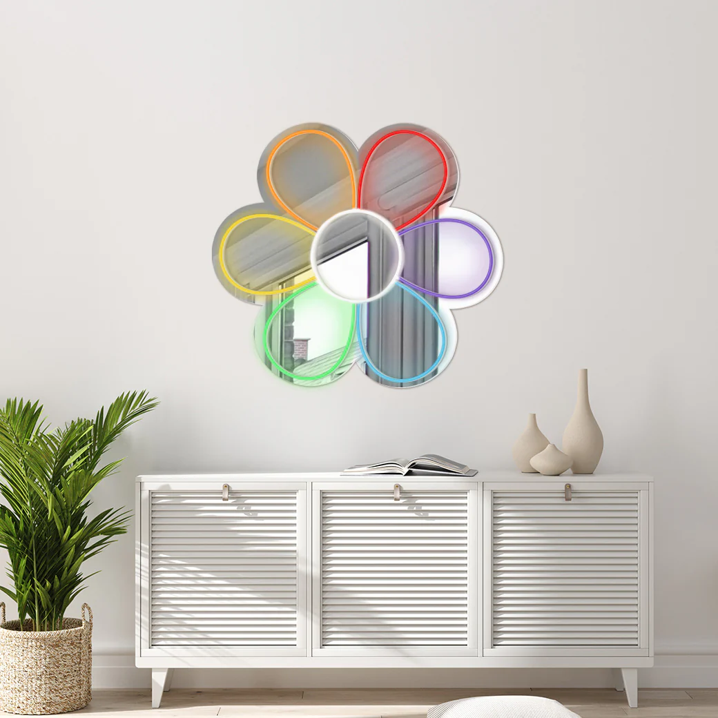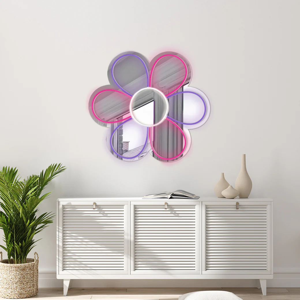 ¡Llena tu espacio de color y buena energía con este espejo decorado con neón en forma de flor! Solo elige tu combinación favorita y ¡llévatelo ya!
