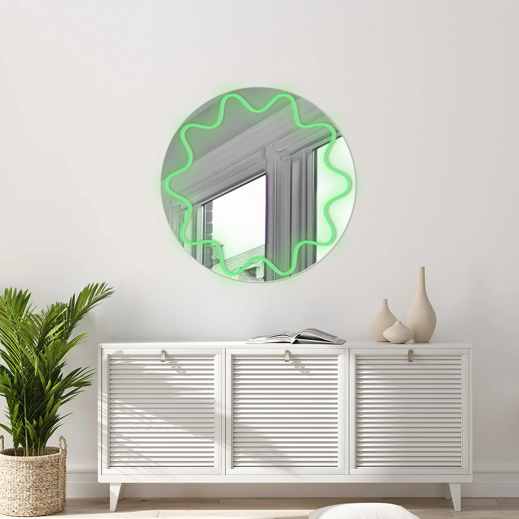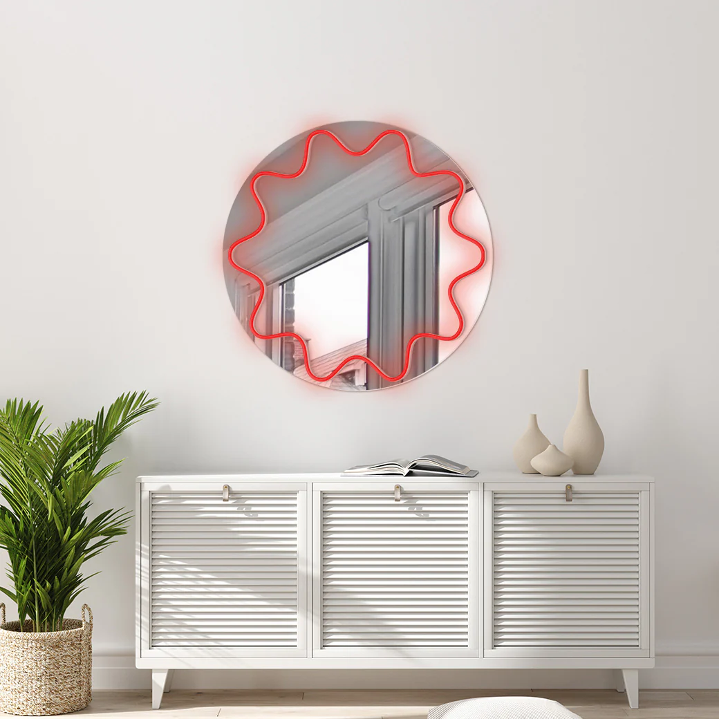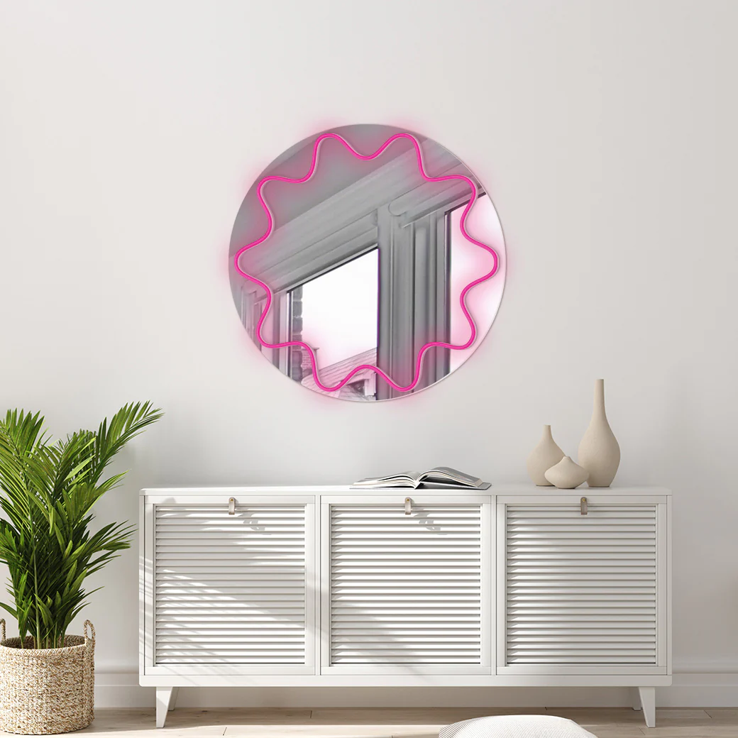 Rompe con la monotonía con este espejo neón que te hará ver las cosas desde otra perspectiva. Te sorprenderá con su forma curva y su luz neón.