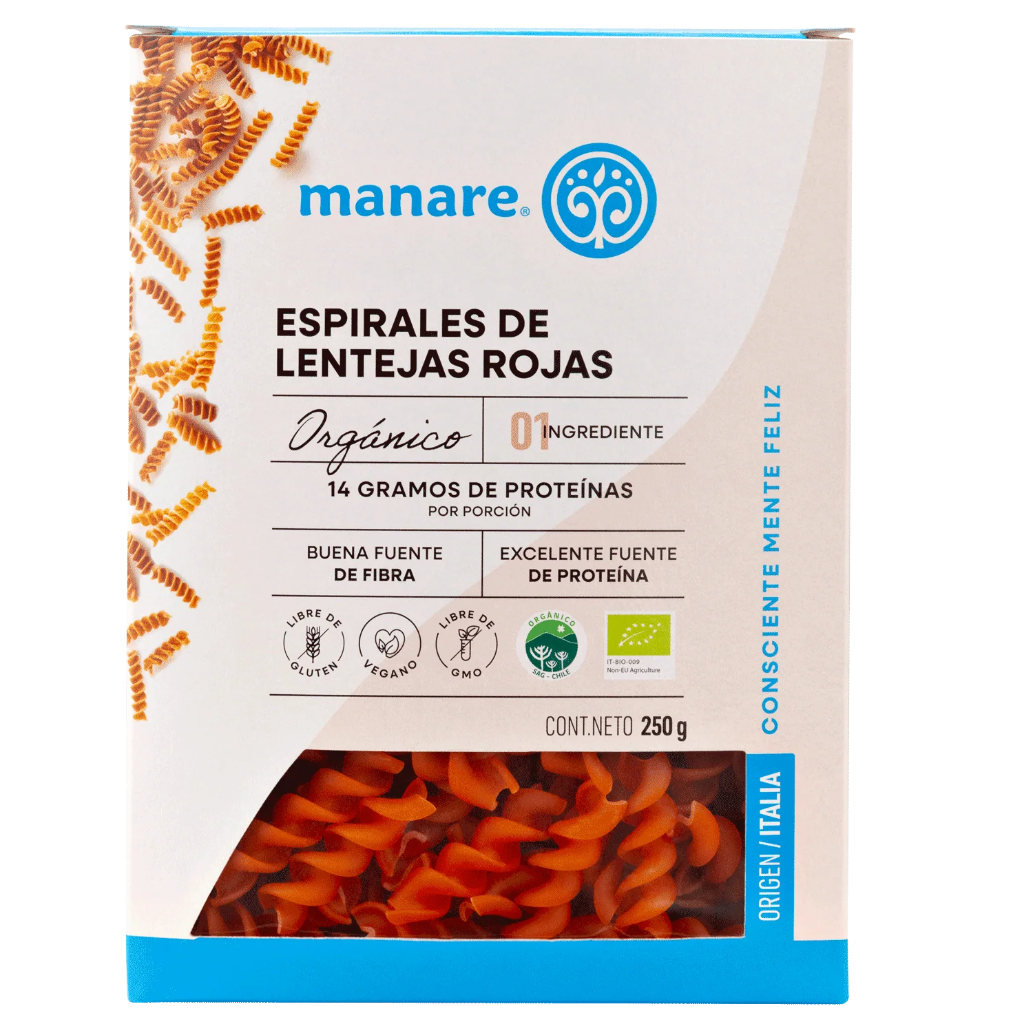 Los Espirales de Lentejas Rojas Orgánicas Manare son una alternativa deliciosa y saludable a la pasta tradicional. Hechos 100% de lentejas orgánicas, sin harinas de arroz, maíz, almidones ni mezclas. Con un alto contenido de proteínas y fibra, son más saciadores y nutritivos que las pastas convencionales.