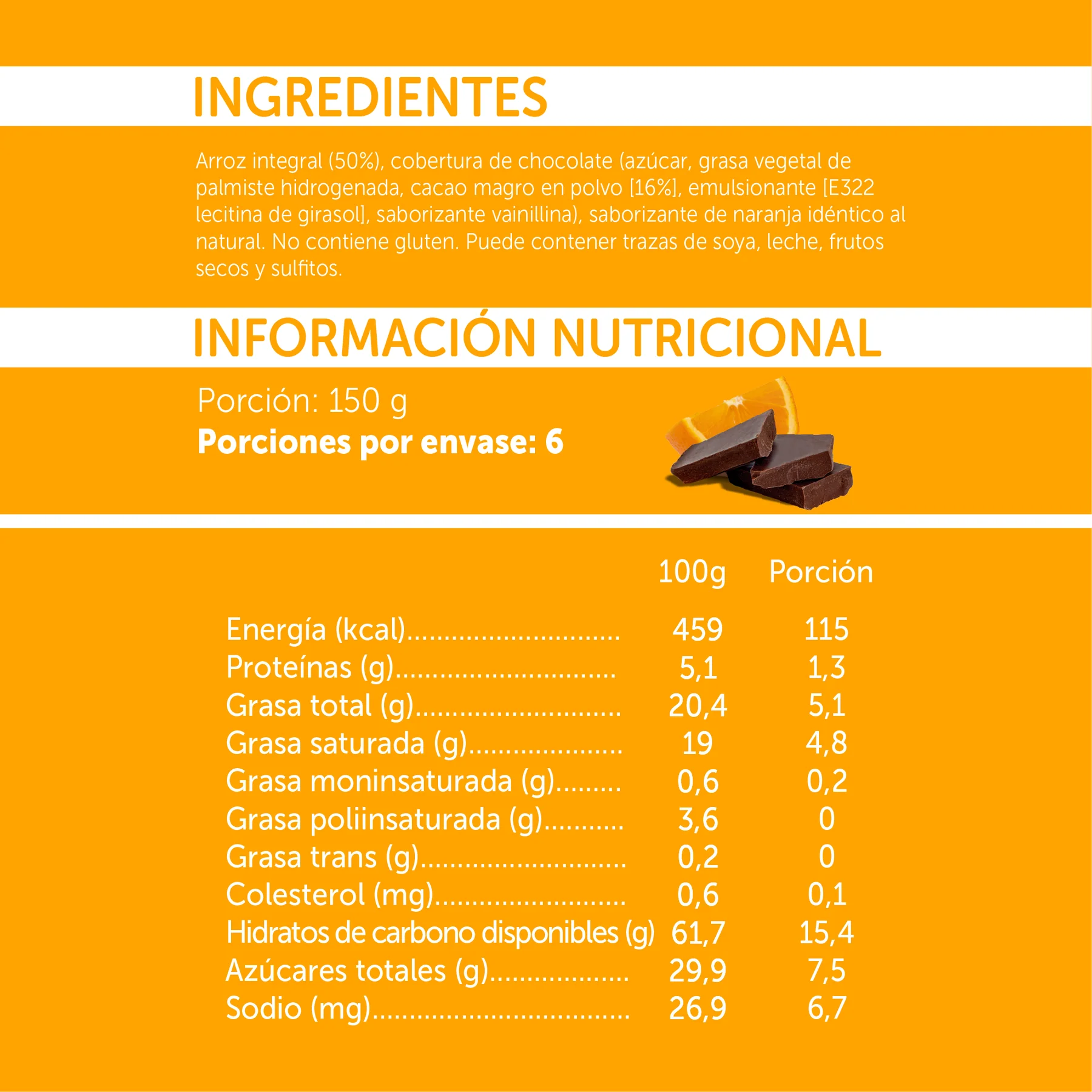 Crujientes galletitas de arroz integral con cobertura sabor chocolate amargo y naranja.