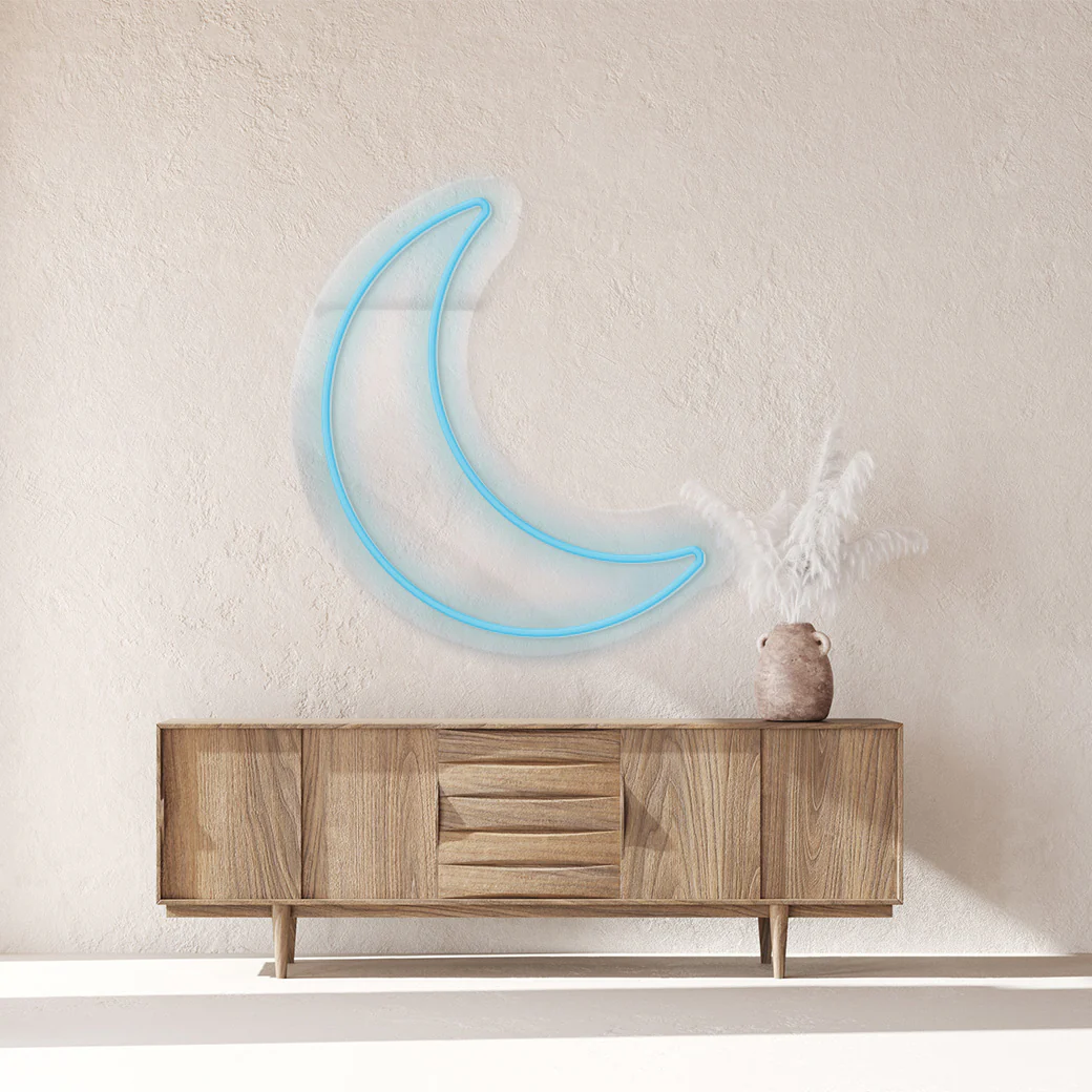 Compra un neón en forma de luna para decorar. La luna en su fase cuarto creciente representa crecimiento, aprendizaje, creatividad y transformación.