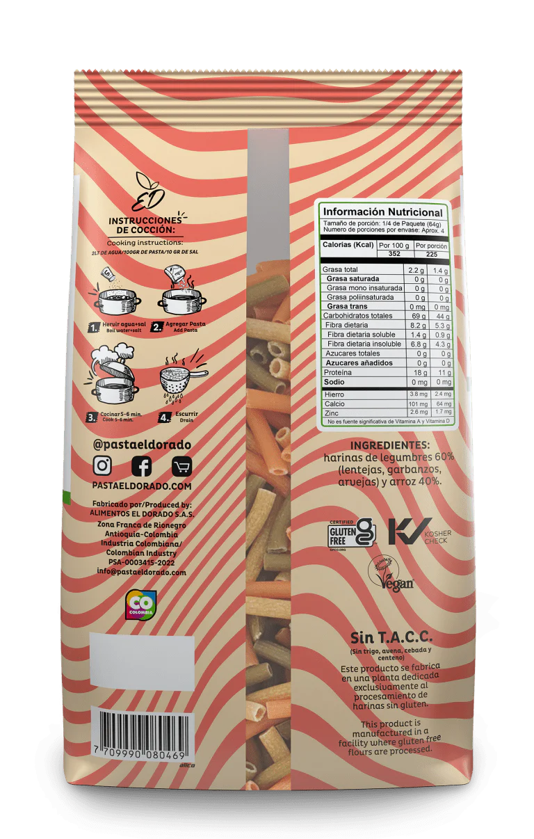 Macarrones Tricolor de Lentejas Rojas, Garbanzos, Arvejas y Arroz Sin Gluten 250gr – El Dorado