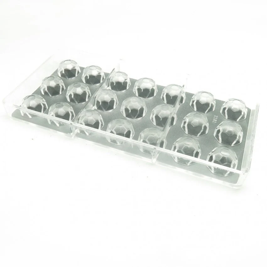 Molde de chocolatería en forma de diamantes por 21 cavidades, su material de fabricado en policarbonato proporciona alta resistencia en su utilizacion, además de aportar mayor brillo a la cobertura de chocolate. Además, distribuyen el calor del chocolate atemperado más uniformemente y reducen las posibilidades de que se formen manchas mates en la cobertura de chocolate debido a la refrigeración, su transparencia permite vigilar los bombones moldeados durante el proceso de enfriamiento.