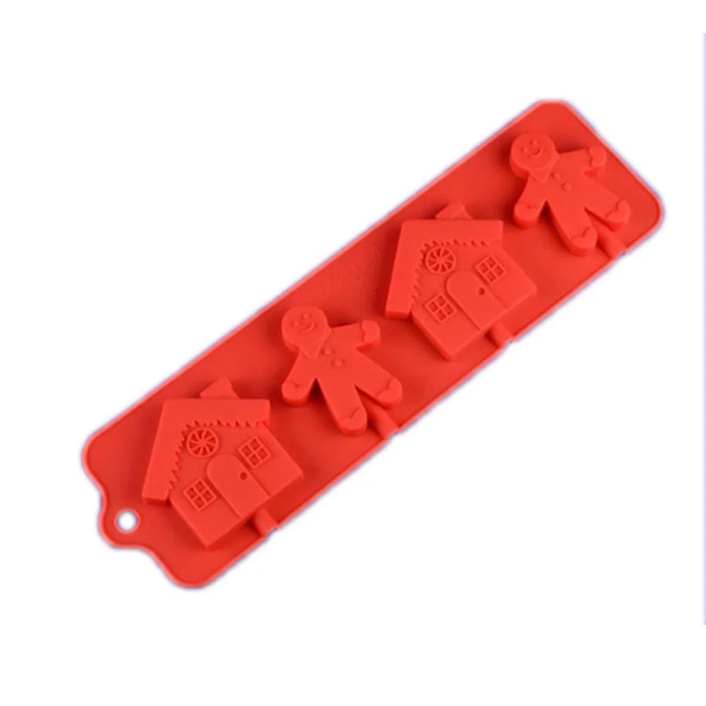 Molde en silicona de navidad por 4 cavidades con diseño de muñeco de jengibre y casita navideña, podemos usarlos haciendo chocolates, galletitas, fondant y más. Fabricado en silicona de grado alimenticio son resistentes al calor y tienen una amplia tolerancia a la temperatura de -0° hasta 230°, aptos para horno y refrigerador.