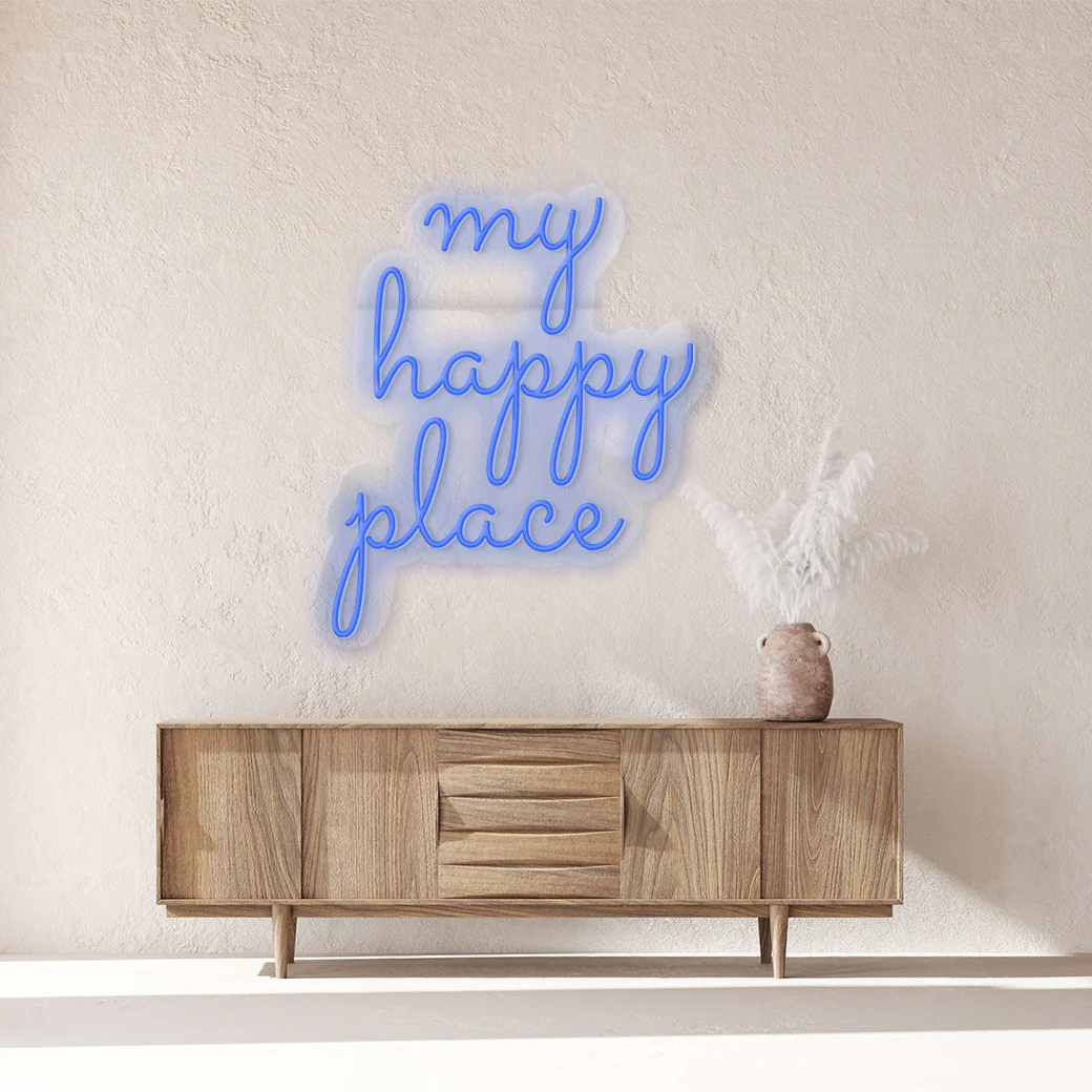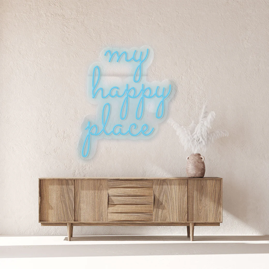 Decora tu pared con este neón y su frase «Mi lugar feliz». Es perfecto para ese lugar donde se reúne toda la familia o los amigos y se la pasan riendo siempre.