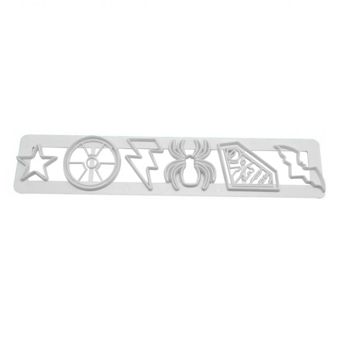 Plantilla de cortadores de spiderman, fácil de almacenar y limpiar, con motivos para cada molde de galleta. Solo con una presión retiras 6 piezas de masa al mismo tiempo.