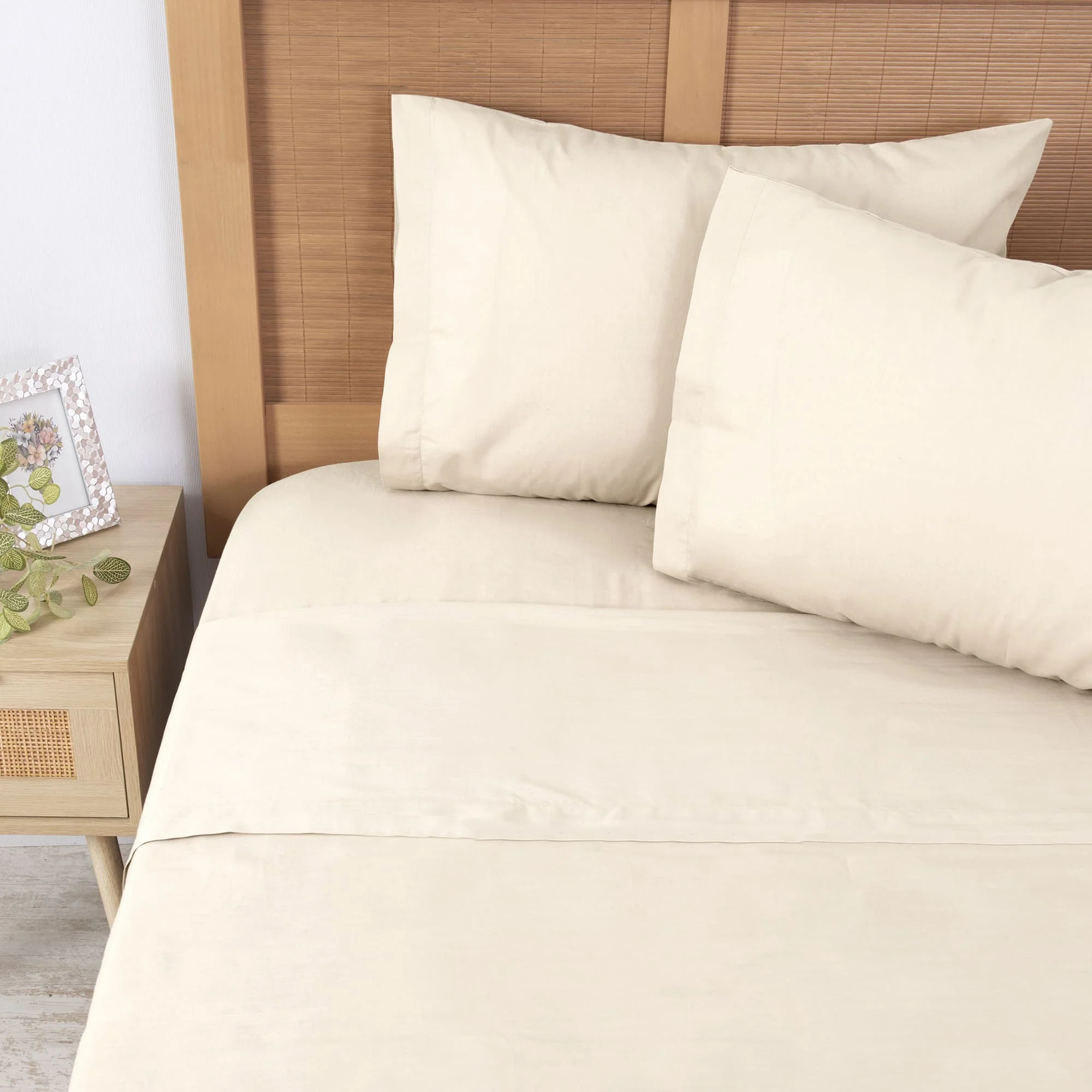 Confeccionada con una mezcla de 50% algodón y 50% poliéster, ofrece una textura suave, fresca y duradera, ideal para el uso diario. Su tejido de 200 hilos proporciona un acabado liso y sofisticado, manteniendo su forma y suavidad lavado tras lavado.