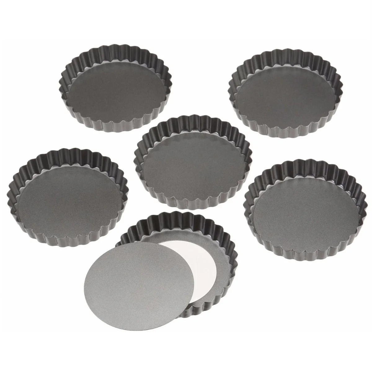 Haga mini tartas y quiches perfectos con este juego de moldes especiales para mini tartaletas. ¡Puede hornear 6 tartaletas o quiches individuales, cada uno con su propio relleno! Cada molde es antiadherente por lo que los alimentos se liberarán con facilidad y la limpieza será muy cómoda, cuenta con una construcción de acero pesado que permite una calefacción uniforme. Apta para lavajillas.