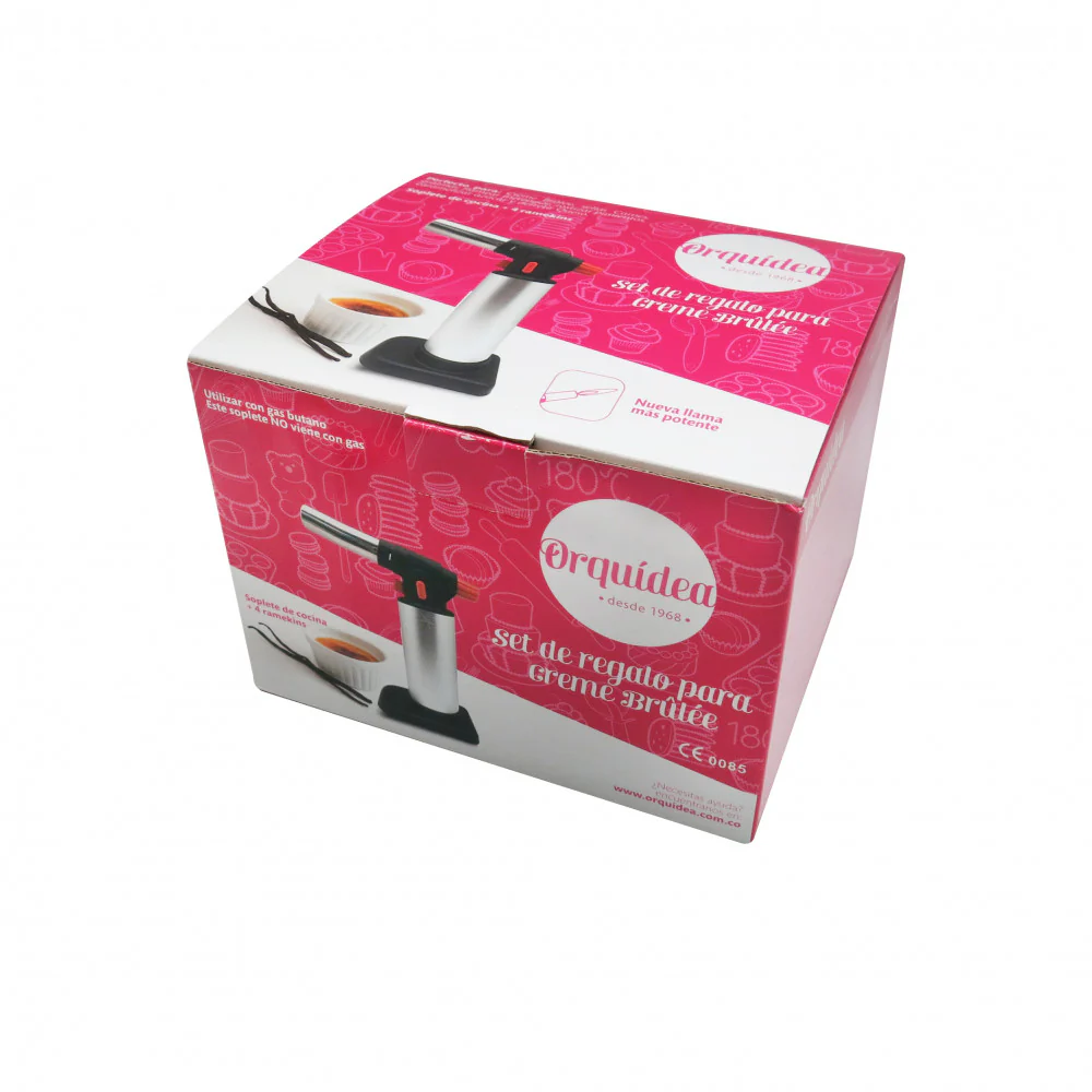 Soplete flameador para repostería y cocina recargable, ideal para utilizar en trabajos de caramelizado, gratinado, sellado o rostizado cualquier tipo de alimento, cuenta con una llama potente por ello tiene una válvula regulable que te permite controlar la salida de la llama ademas cuenta con un botón de seguridad. No incluye los ramekins, ni el tanque de gas.