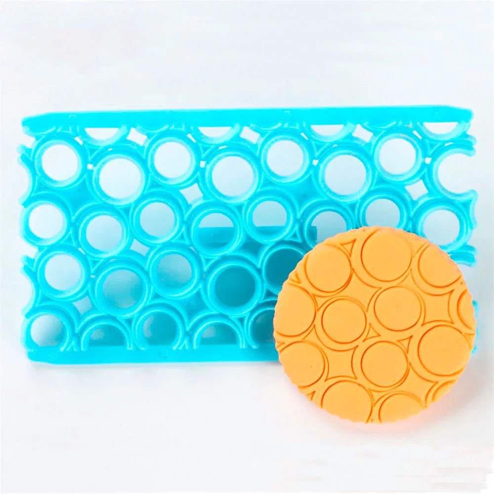 Plantilla decorativa para añadir texturas y relieves en forma de circulos para superficies de fondant, pastillaje, mazapán y pastas moldeables, solo debes pasarlo en superficies planas y presionar de forma uniforme para dejar mejor marcada la textura. Su material de fabricación es 100% de plástico de calidad Alimentaria, Material no tóxico y sin olor.