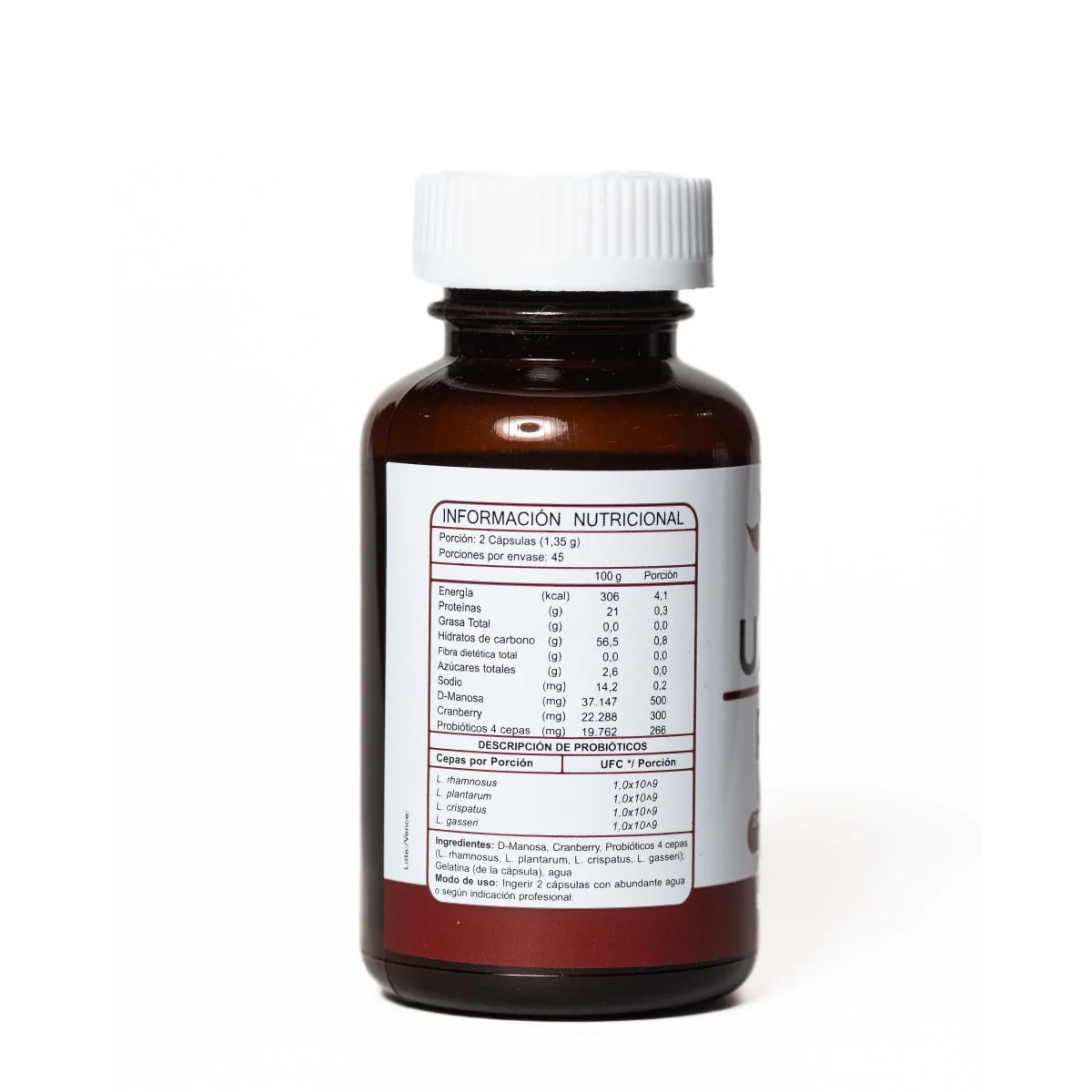 Ingredientes: D-Manosa, Cranberry, Probióticos 4 cepas (L. rhamnosus, L. plantarum, L. crispatus, L. gasseri), Gelatina de la cápsula, agua.